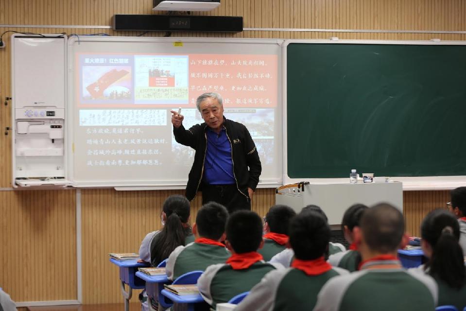 课上李惠军老师用长征典型性油画、用历史亲历者和见证者毛泽东的诗词等史料为基,在诗情画意中,用极具感染力的语言、用出神入化跌宕起伏的故事给孩子们勾勒波澜壮阔、险象环生的长征之路。也在催人泪下的历史故事和环环相扣的历史细节中,温润感动学生,让学生感受到了长征的军魂国魂。