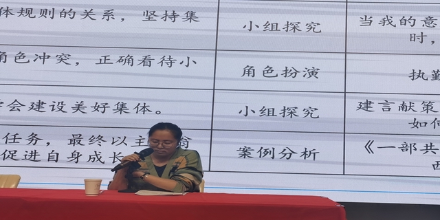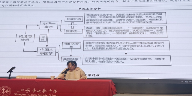 本次活动分两个环节进行。第一个环节由几位老师分享基于课程标准的单元教学设计以及课堂教学设计。晶城中学周筱清老师分享了《在集体中成长》这一单元设计,并从中国女排的故事设计《集体的生活邀请我》一课。通过女排夺冠设计一系列问题引出集体的温暖和集体的力量。马桥强恕的孙莉黎老师分享了《参与民主生活》单元与课时设计,亮点是从拨打市长热线到红领巾议事堂和模拟政协的活动吸引学生的眼球从而展开教学;文来中学的老师先分享了《文明与家园》的单元整体规划设计,然后分享了单元内《中华文化根》的教学设计,分别从赏中华文化之美、立中华文化之信、做中华文化使者三方面进行教学的探索。莘松中学张家榕老师、上虹中学的王艺儒老师以及复旦万科的吕晓蕊老师也分别分享了单元规划以及单元内的一课教学设计。她们在教学设计中都非常注重在整个单元内谋篇布局落实每一课时的教学内容,统筹规划与安排,注重前后关联。每一课的教学设计也注重以学生为本、整体性与条理性,基础作业、应用类作业、拓展作业多样的作业形式以及多样的评价方式,都能让学生更积极有效地参与课堂学习,从而提升学科素养。