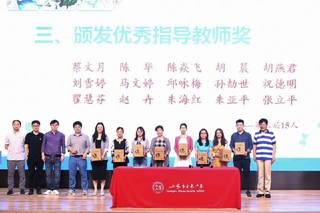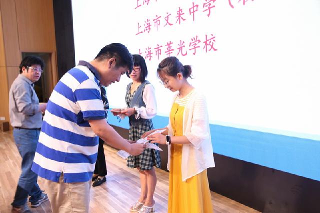 文来中学两位荣获一等奖的学生代表吴晨璐、袁粟怡到现场接受颁奖;荣获第四届优秀指导奖的蔡银银等16位教师、第三届优秀指导奖的蔡文月等15位教师,以及获优秀组织奖的华东师范大学第二附属中学附属初级中学、上海中医药大学附属闵行晶城中学、上海市文来中学(初中)、上海市莘光学校四所学校的教研组长,依次接受颁奖。文来中学柏彬校长出行了活动,偕同与七宝中学负责地空平台的黎挺、张亮、金冶等老师一起给获奖教师颁奖。