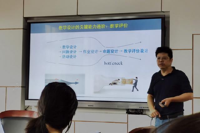 第二个环节是地理教研员周光明老师的专题讲座《“双新”背景下的高中地理教学创新》,周老师结合开学阶段的调查走访、问卷信息收集,分别就双新推进工作背景思考、学校地理课程整体方案建议、高中地理新教材的特点、课堂教学的策略与建议等做了详细的分享。