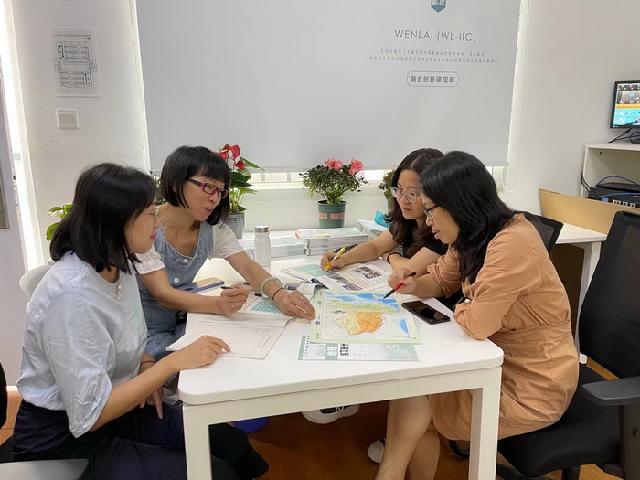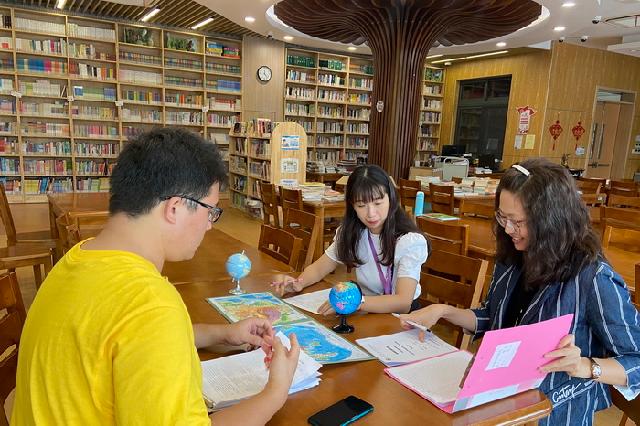 全区初中各学校地理学科组,则自主安排了“初中地理学科建设与课堂改进行动”校本教研。大家选择在学校优美、清静的图书馆、资料室、党建办公室、专用教室等不同场所,三五成群讨论教研组学期工作,完善计划。