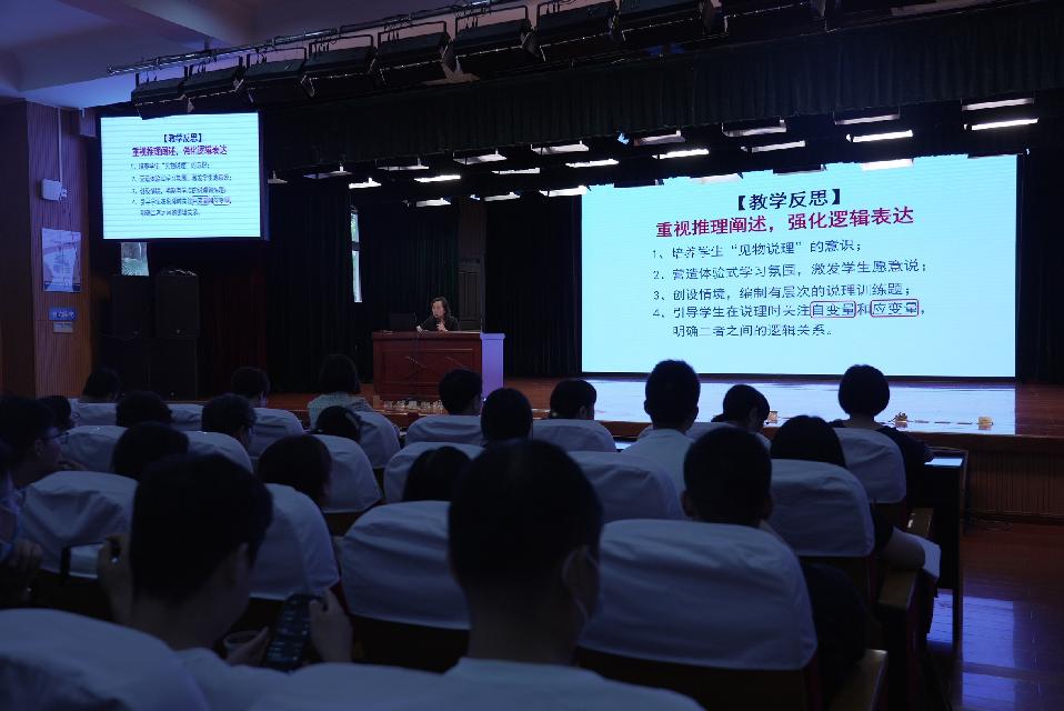 最后戴老师给大家讲了新中考和“双减”背景下的教与学。她从新中考改革的目标、“双减”政策的意义两个方面展开。提出我们应该从自身作出改变,适应新时代的变化,减少自己的惰性和惯性。戴老师指出,课堂教学过程中不仅要强调逻辑、过程、证据和规范,更要体现课堂中的学生主体地位,将话语权多给学生;她还强调要注重课堂教学和作业设计,提高课堂和作业的效率。并勉励大家做一个自信、笃定、有爱的物理老师。