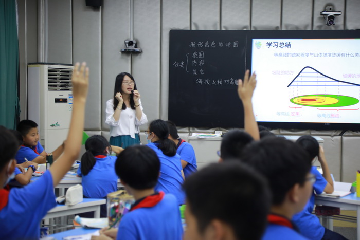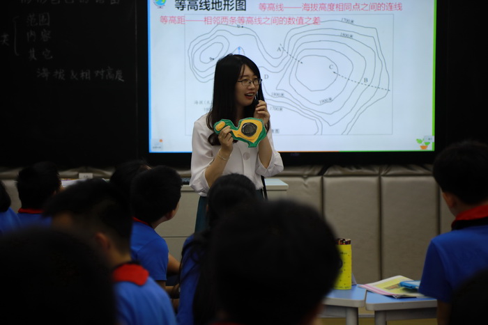 这些贴近生活实际、带有真实区域情境的具身学习活动、思考、交流,是整堂课的亮点。“选地图,做攻略”,学生以小组为单位,共同完成了地图的不同分类、主要用途等练习题;“比高度,学概念”,帮助学生区分、归纳海拔高度与相对高度的概念;“登山峰、选路线”,学生们在老师的指导下,借助课前制作的华山地区等高线模型,尝试绘制分层设色地形图、判断地势高低及缓坡、陡坡。这些学习活动,既提升了学生的地图阅读能力,又培养了学生良好的表达习惯。