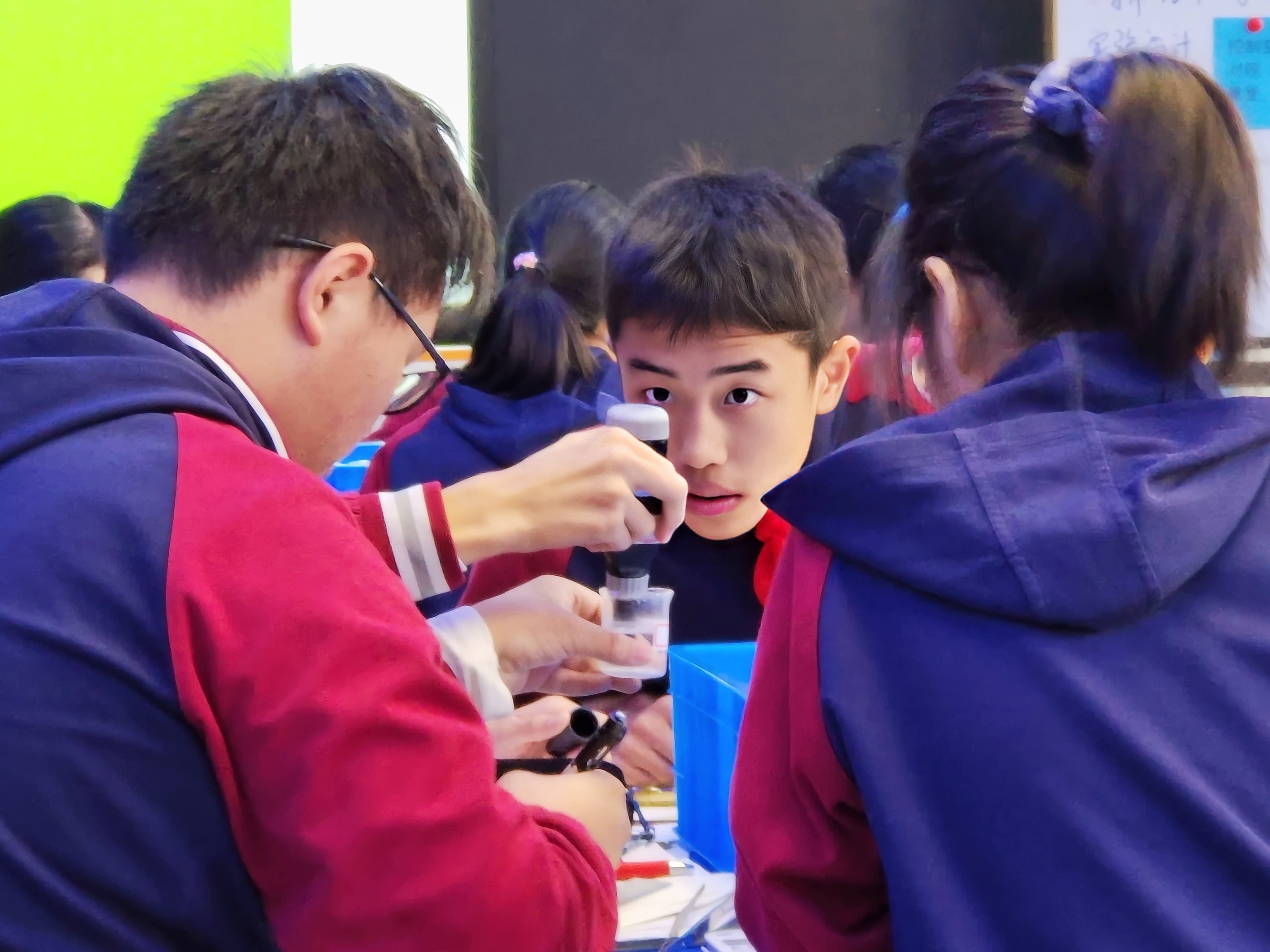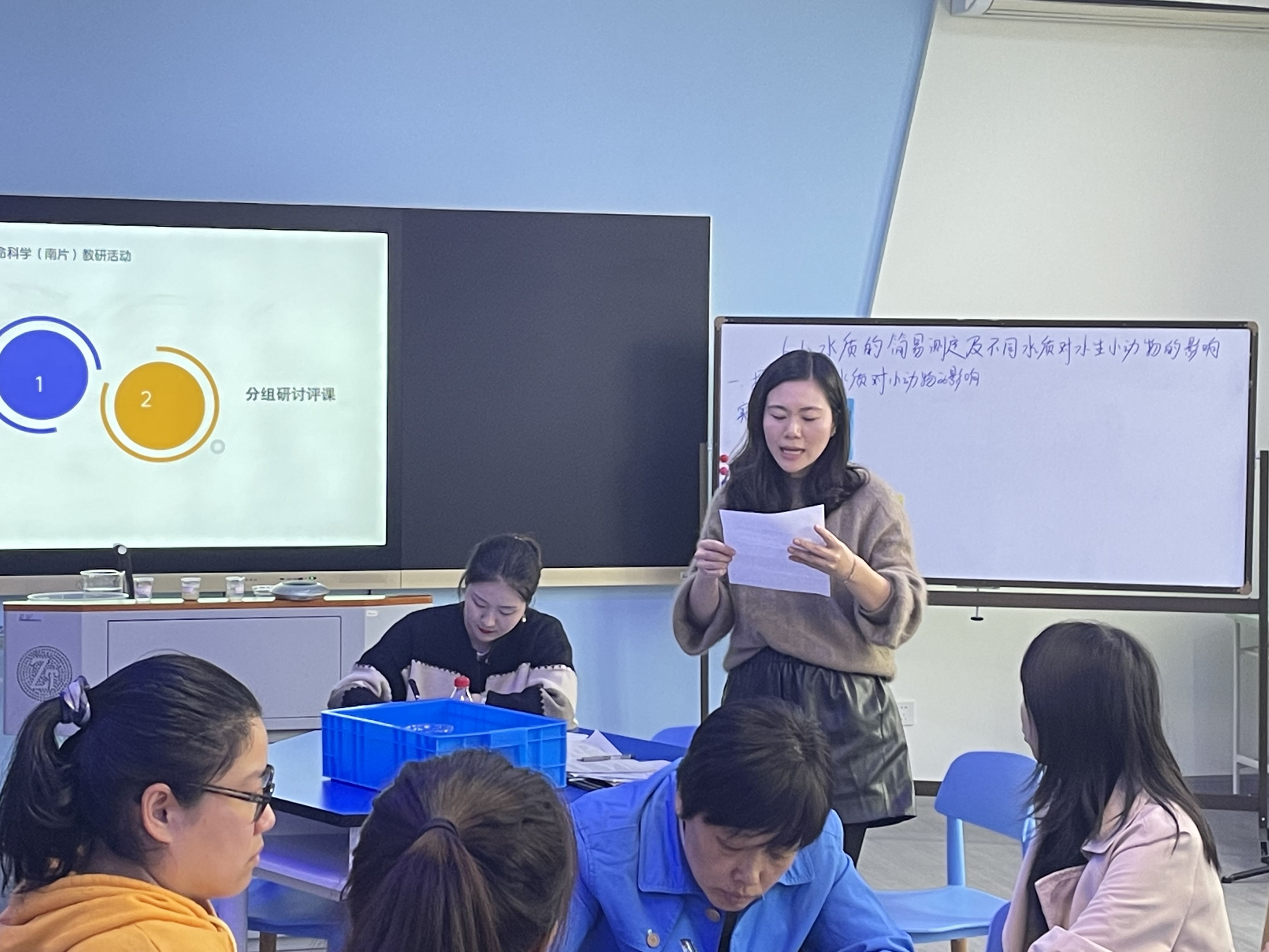 接着,南片老师们进行分组研讨,有不少老师还动手操作起实验桌上的PH电子测定仪及传感器,整个研讨氛围浓烈而愉快。随后,各组代表分别交流和分享对本节课的想法和建议。大家充分肯定了张老师精心设计的三个探究活动,另外,对课上利用和整合了空中课堂跨学科资源,有利于培养学生“创新思维阐释能力”以及时刻把控课堂,有效调动学生的学习积极性也很认可。当然,老师们对这节课也提出了一些建议,比如可以从学生课前探究活动的结论来寻找原因,再通过不同归因,师生共同得出水质的观察指标,可能比直接介绍更精彩等。