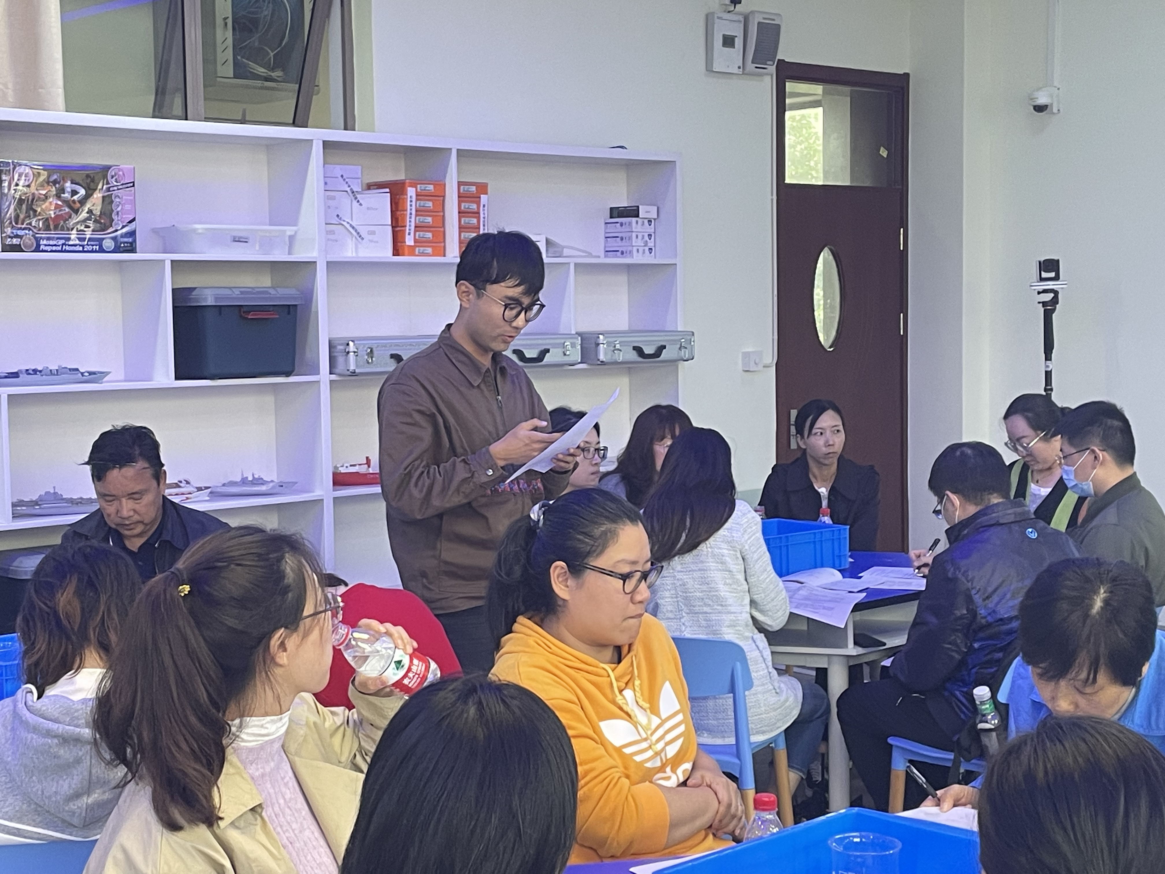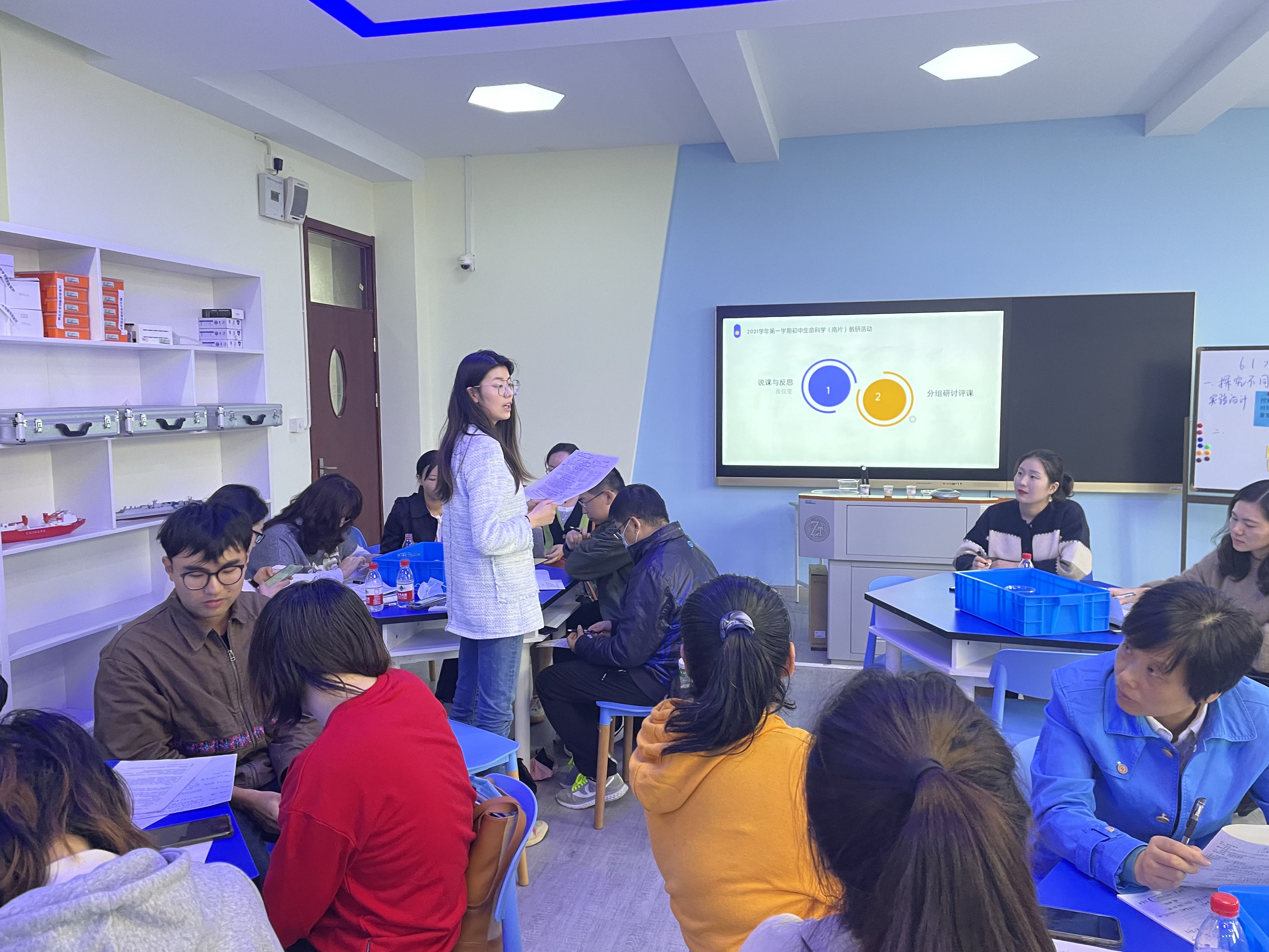 然后,张老师就这节课的设计进行了说课。张老师介绍了她设计课前探究活动上的困惑与纠结以及如何完善探究活动设计的过程,感谢了磨课中的区中心组宋丹婷老师以及校学科组老师的建议和帮助,分享了区生命科学教研员戴赟老师的指导下所作的①充分利用学生课前实验成果进行教学活动的设计②精心设计小组合作研讨分析活动③融入9年级第二学期跨学科空中课堂前滩湿地案例等的改进,从而使学生从家庭实验到课堂实验和课外实践在不断深入的实证中达到学习目的的教学思路。