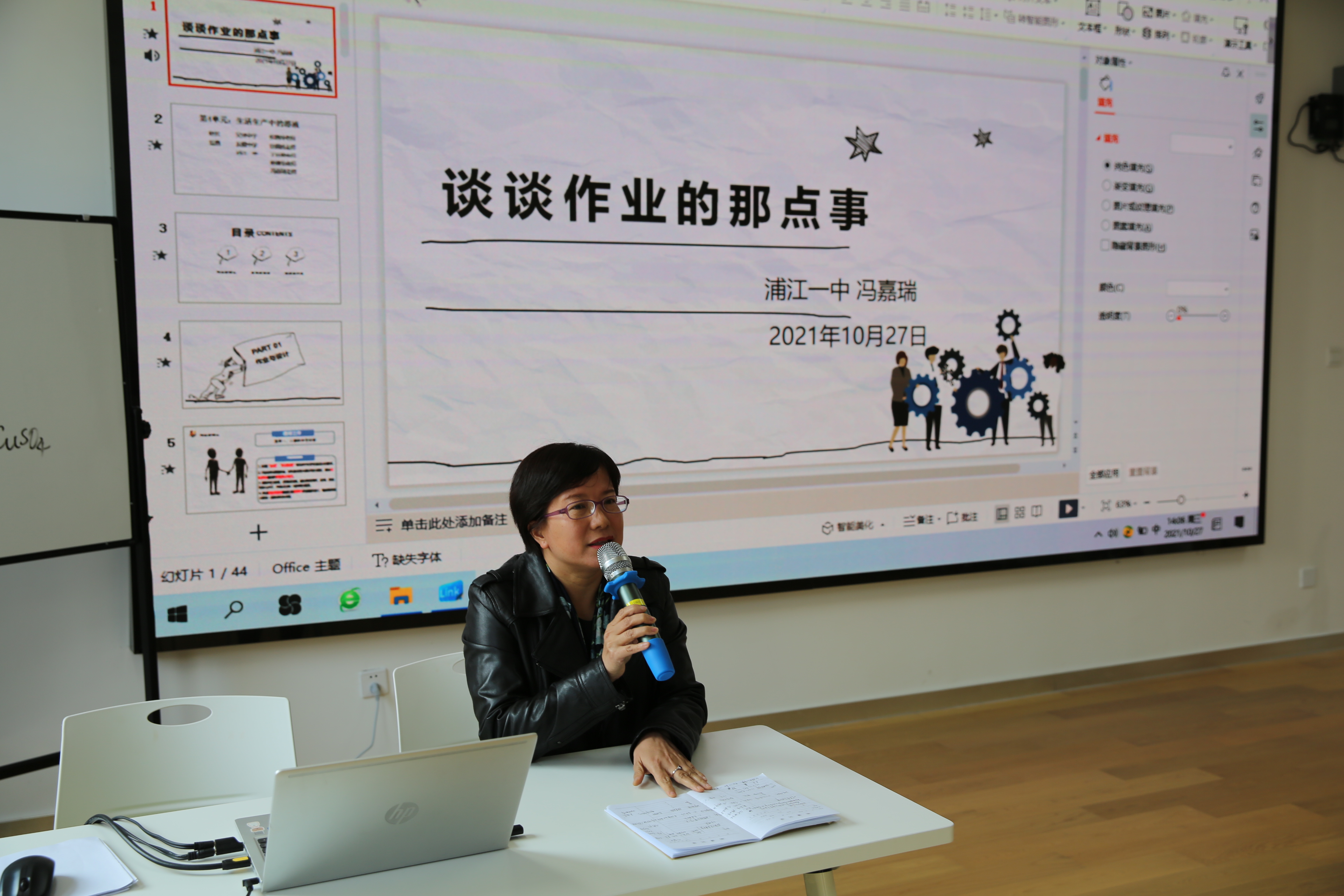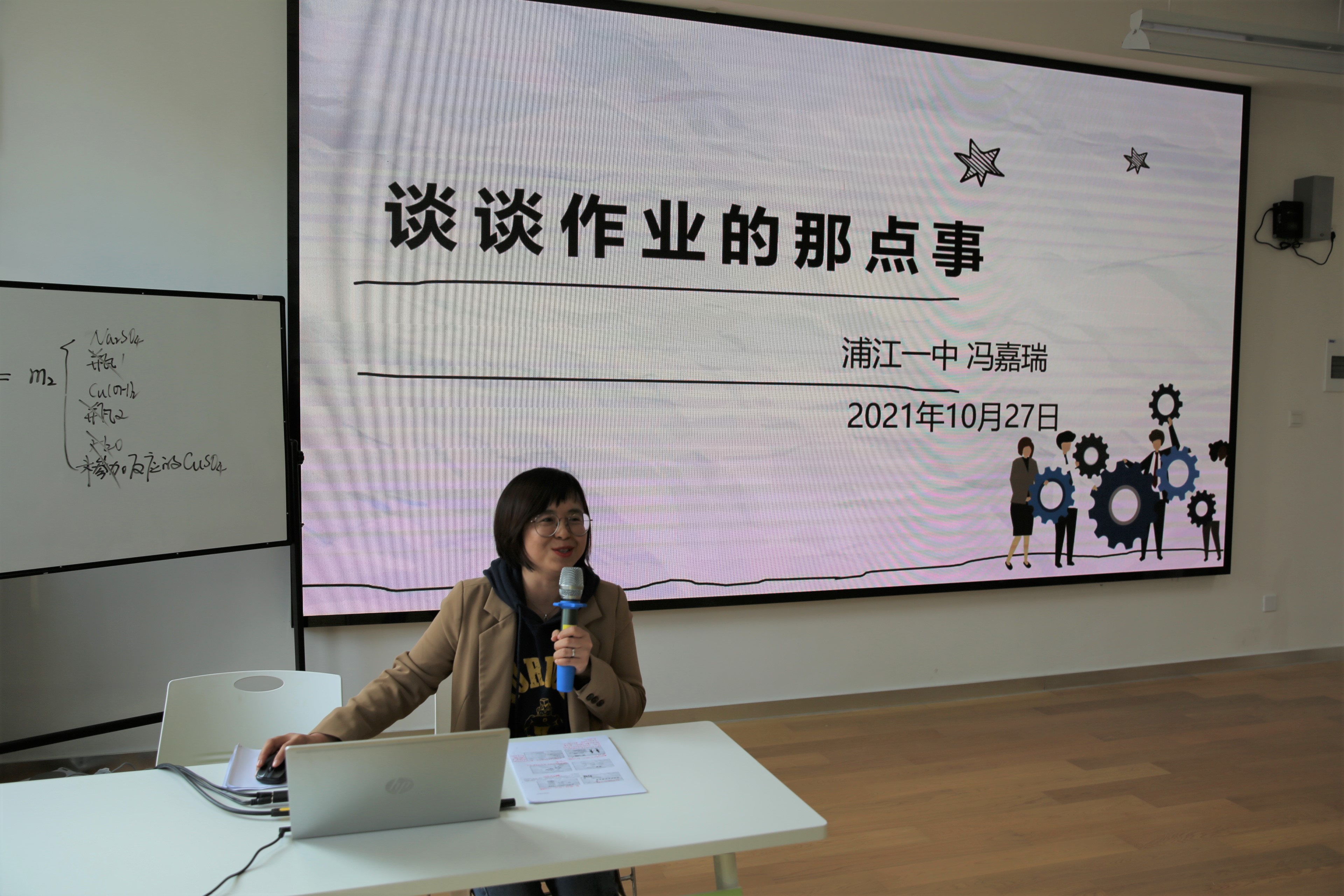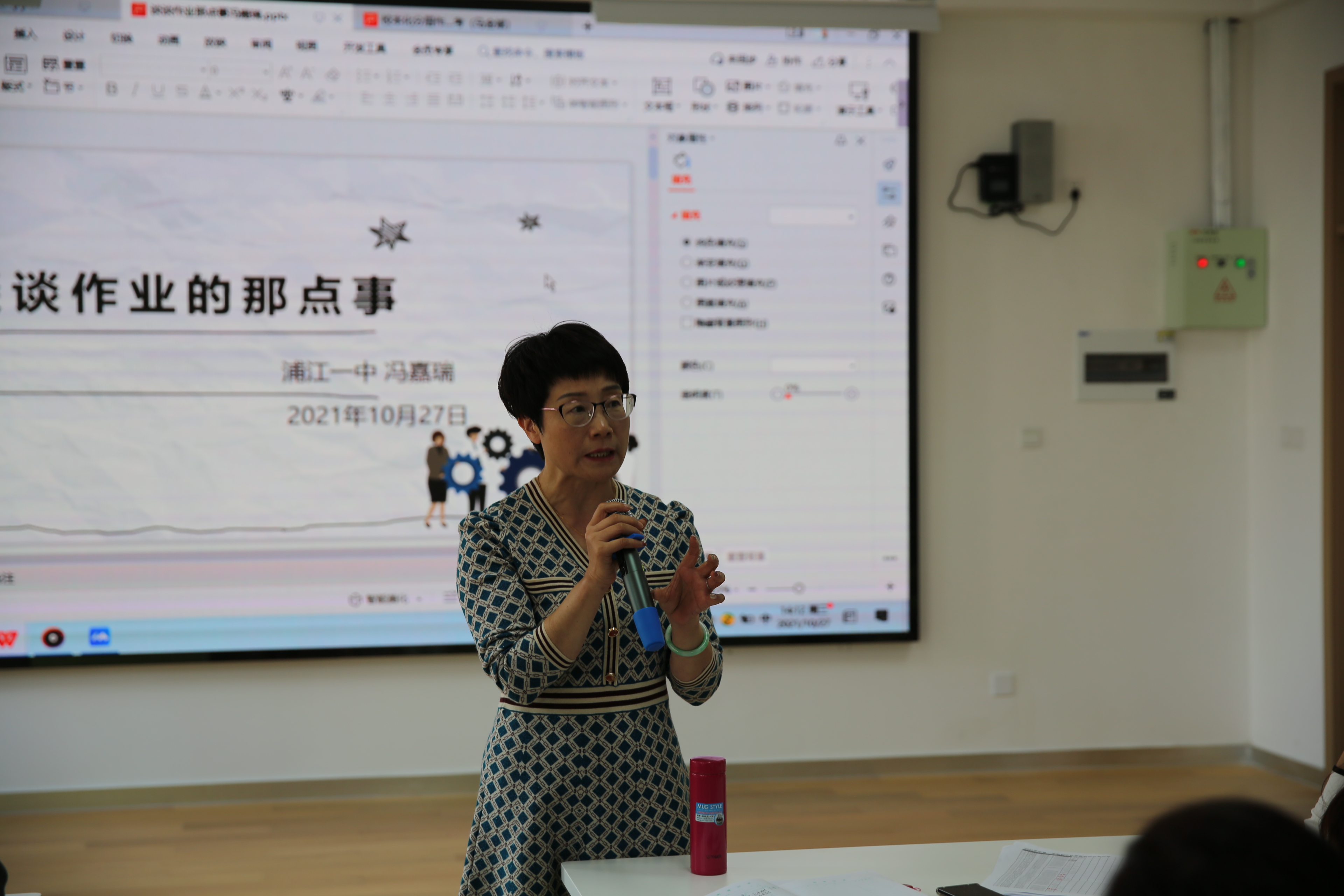随后,浦江一中的冯嘉瑞老师就市单元作业案例设计进行了交流。冯老师主要从作业与设计,反思与改进,现状与将来三个方面谈有关作业的想法。她提到,作业设计要体现知识梳理,巩固练习,拓展提升的功能;展现求全,求新,求细等特点,并以各式各样的案例,比如“糖的前世今生”,“自制三层彩色水”等阐述了作业要创设真实的情境,展现概念的形成过程,丰富作业形式。最后她提出单元的校本作业设计要综合考虑课程标准、学生情况、单元教学目标,设计的方式等因素,并指出作业有效设计的脚步将永不停歇!冯老师关于作业设计的想法和反思,为广大教师提供了理论依据,又展现了丰富的案例。