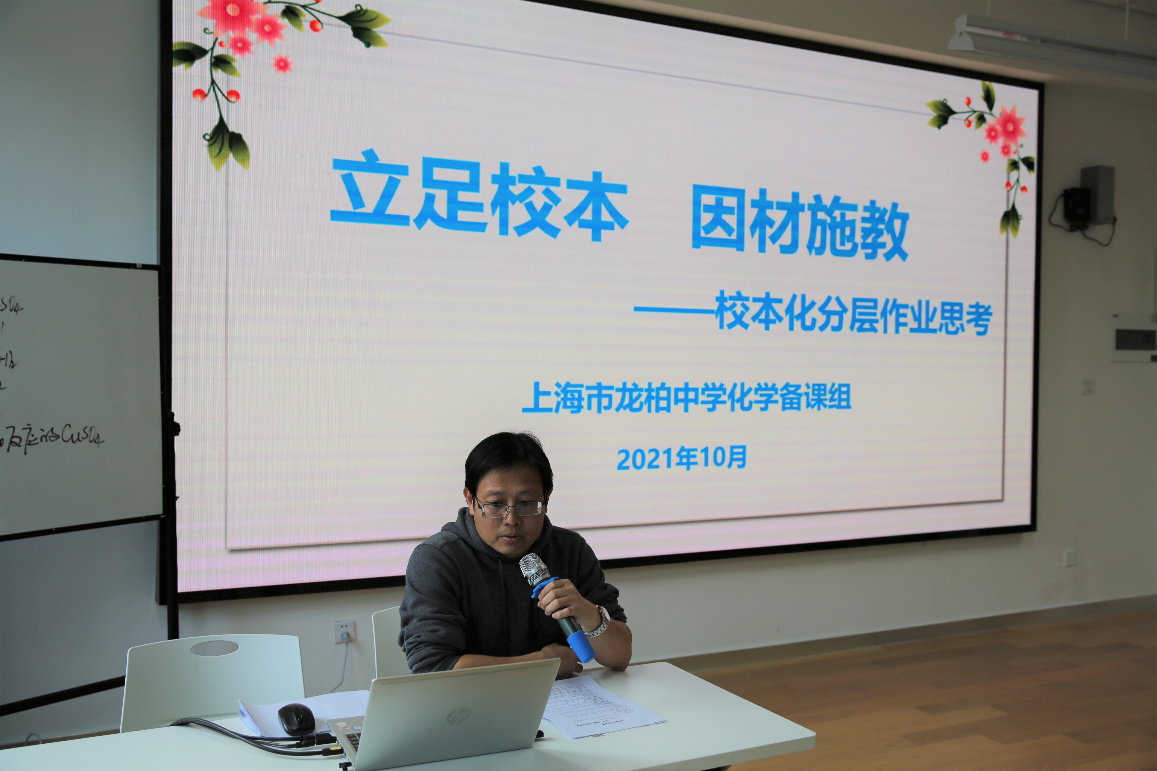 接着,龙柏中学的马金斌老师就校本化分层作业展开交流。马老师讲解了分层作业的背景、设计特点、设计策略等理论依据,同时以龙柏中学的“修炼手册”、“荣耀之路”校本化作业为例,强调基于学情的作业设计。马老师还以学生自制的实验视频,比如鸡蛋的沉与浮,自制汽水等为例,强调作业要还原化学学科的实验特点,将活动推向了高潮,为教师提供了有趣有料的案例。在场的教师无不全神贯注,纷纷点赞。最后马老师指出分层作业设计要体现科学性、适切性、有效性、提升素养的特点,现场掌声不断。