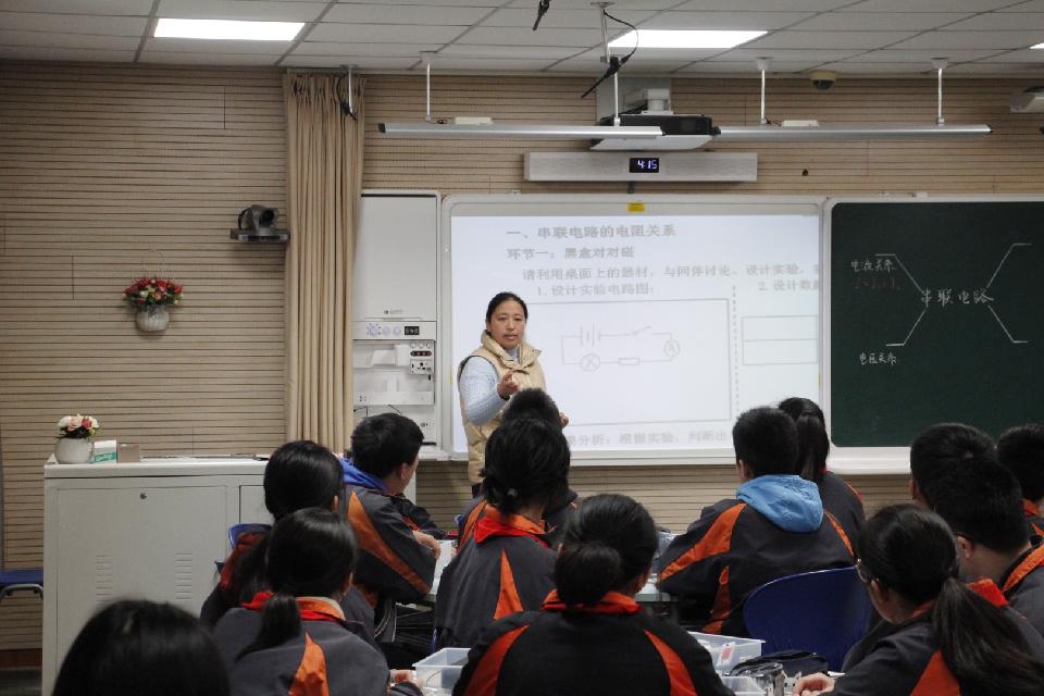 臧丽丽老师执教的是九年级《串联电路2》一课,臧老师运用一个电学实验引入本节课新课;通过实验寻找黑盒的等效电阻,从而引入串联电路的总电阻概念和电阻关系;通过与同一直线上力的合成中的“合力”进行类比,理解“总电阻”概念中所蕴含的等效替代思想;建构出串联电路电阻的关系,并通过实验数据归纳出串联分压规律。
