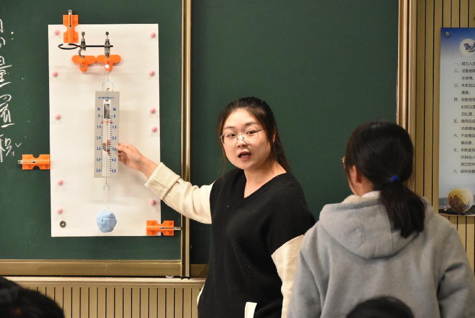 首先老师们在线观看了马桥复旦万科王贺老师和闵行四中臧丽丽老师的课。王贺老师执教的是八年级《重力》一课,王老师通过播放神舟13号航天员们的生活视频引入重力概念;通过演示实验探究重力的方向;运用控制变量法研究影响重力大小的因素。