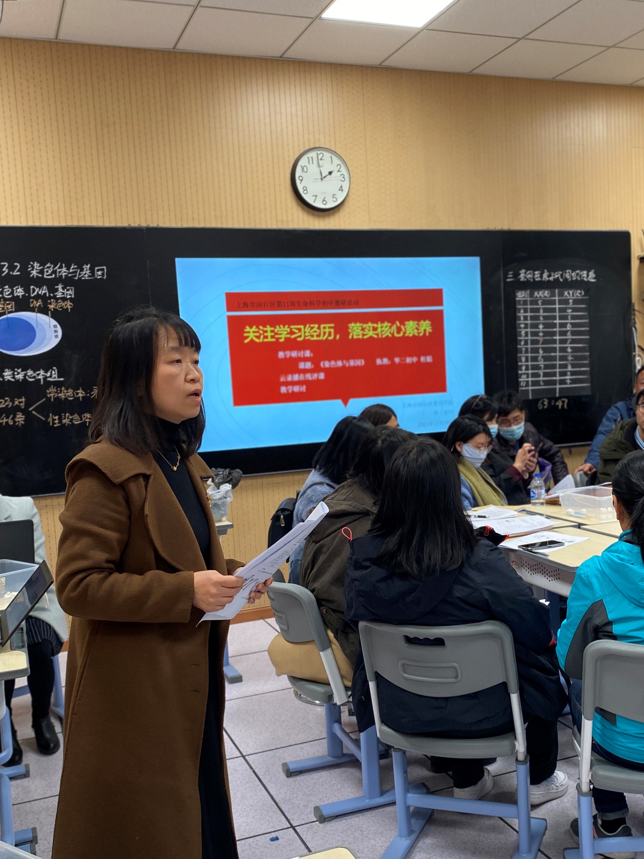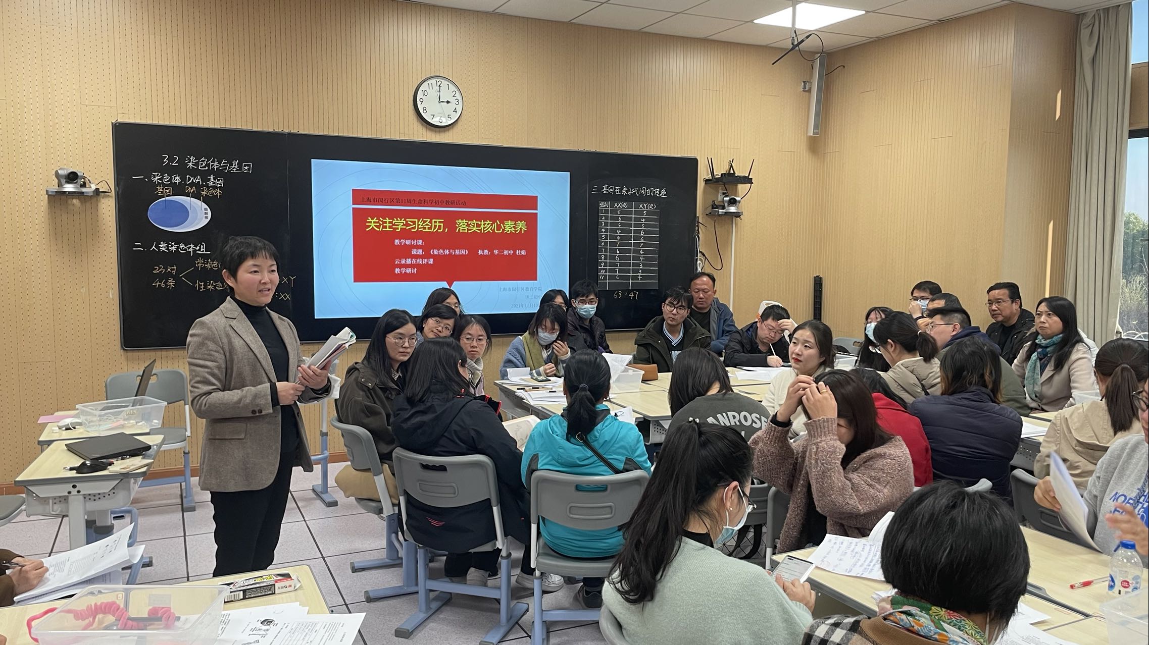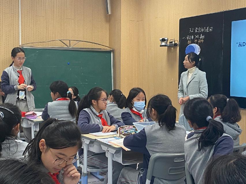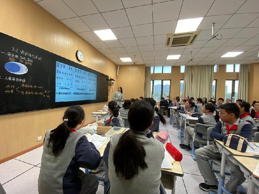 首先,华二附初杜娟老师带来了《染色体与基因》一课。杜老师基于真实情境,开展问题导向的探究式课堂教学,在课堂中引导学生发现问题、分析问题和解决问题,以此达成学习重点、突破学习难点,促进学生核心素养的落实。