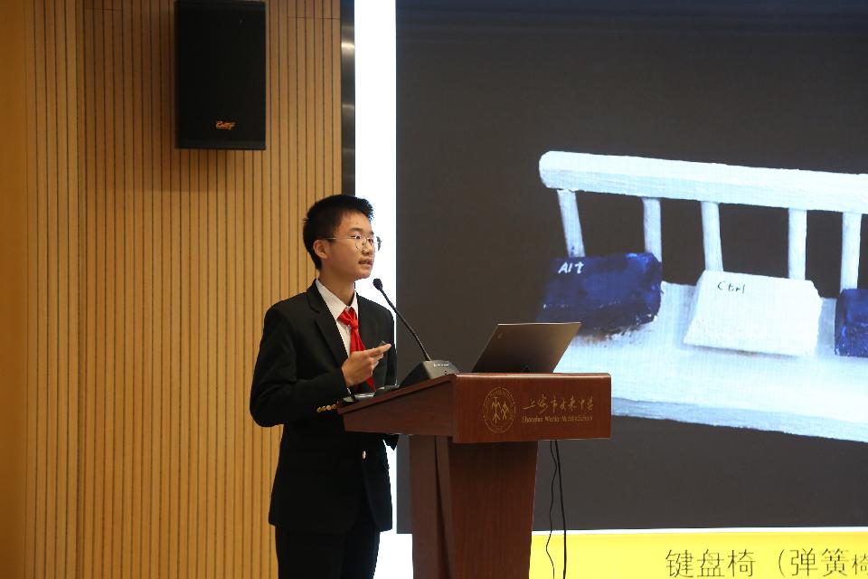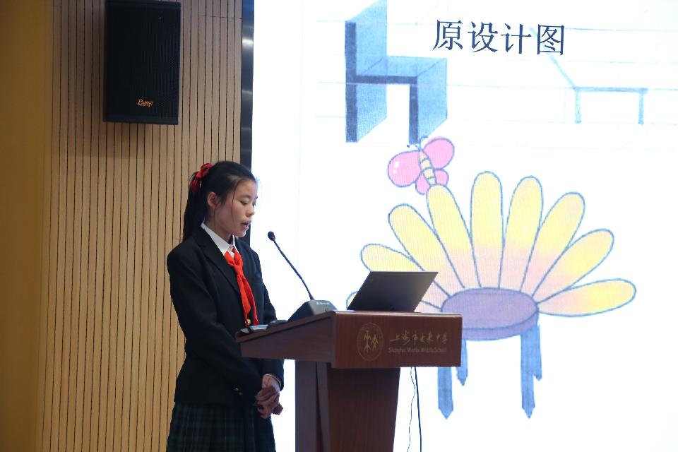 接着,上海市文来中学劳动技术教师戴玉眉带领七年级两位学生进行了美劳共育的单元作品展示,戴玉眉讲到根据美术学科椅子设计构思的草图和纸模型,绘制零件图,按照零件图尝试制作木艺椅子模型,过程中遇到生成性问题则优化设计或改进加工技术,最后木模成型。