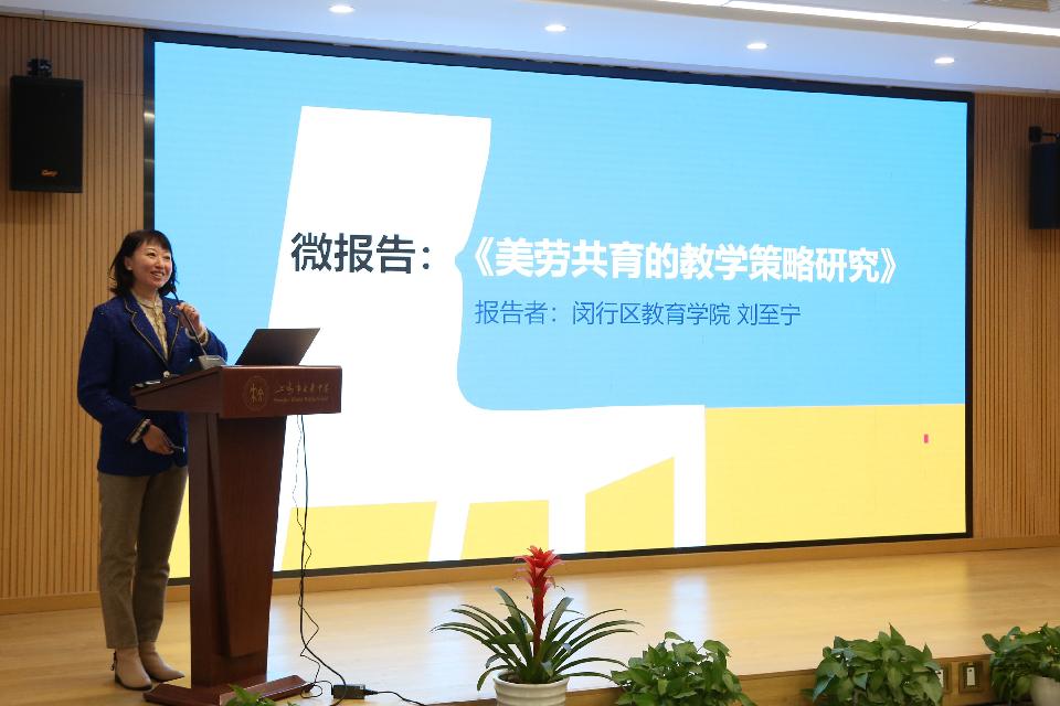 闵行区教育学院劳动技术教研员刘至宁以“美劳共育的教学策略研究”为主题作微报告。以纸艺、食品雕刻、木工艺为例提出合理运用教材,创设美劳共育的内容载体;梳理单元学习技能,开发综合性技术应用项目;挖掘影响技术实现的重难点,搭建学科互通式桥梁;根据作品呈现效果,灵活选取并整合教学内容这四点作为实施美劳共育单元设计的教学策略。