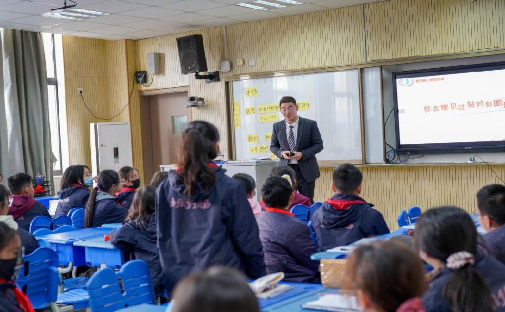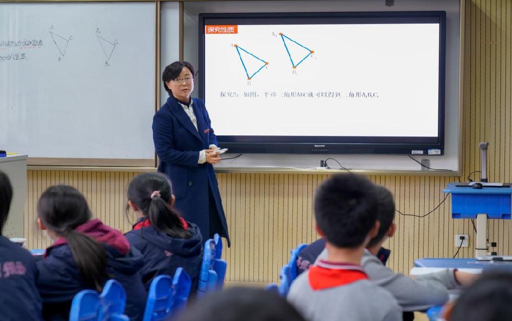 研讨环节,教研员张胤睿、各校数学老师围绕两位老师的课堂思路、课堂呈现形式等方面进行了深入探讨:江老师的课能够抓住学生的学习兴趣,使学生对“平移”直观上的初步认识转变为对“平移”的定义、性质的充分认识,通过俄罗斯方块、联系现实生活中平移图形的方法,让孩子们通过讨论,自主探究等形式进行学习,这些活动在培养学生们的数学思维能力的同时,更是通过有趣的数学活动激发学生们学习数学的兴趣;王老师能够让学生在合作中学习,通过设置情景:“布置圣诞树”这一有趣的教学活动,让学生在乐趣中充分体验了翻折与轴对称在现实生活中的运用,最后通过合作完成探究题,让学生进一步巩固对于翻折与轴对称概念的认识与运用。两位老师都能够寓教于乐,受到了教研员张老师的的充分肯定。