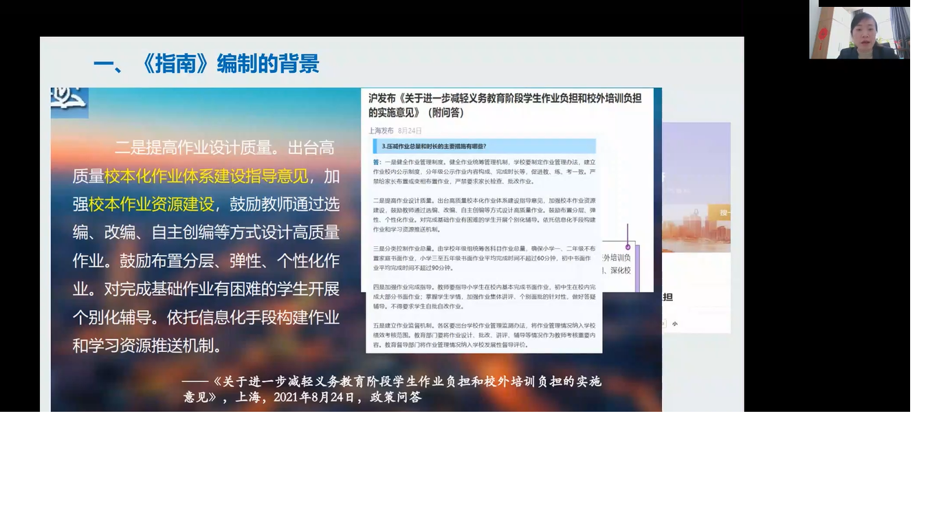 接下去,文来中学任欢菁老师以《关注作业设计,提升教学质量》解读上海初中物理高质量校本作业体系设计与实施指南。她以校本作业具体实例为抓手,通过《指南》编制的背景、结构,《指南》内容和后续推进的解读,为教师在“双减”环境下编制校本作业提供了高大上而又接地气的操作路径。