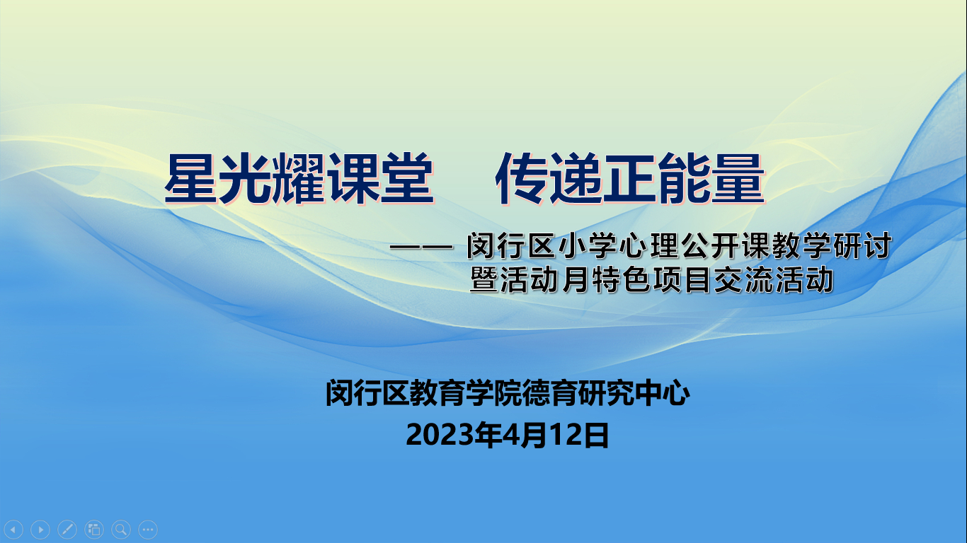 4月12日下午,以“星光耀课堂 传递正能量” 为主题的闵行区小学心理公开课教学研讨暨心理活动月特色项目交流活动在闵行区实验小学多功能厅举行。本次活动由区小学心理教研员徐涛老师主持,来自全区小学及九年一贯制学校的专职心理老师参加本次活动。