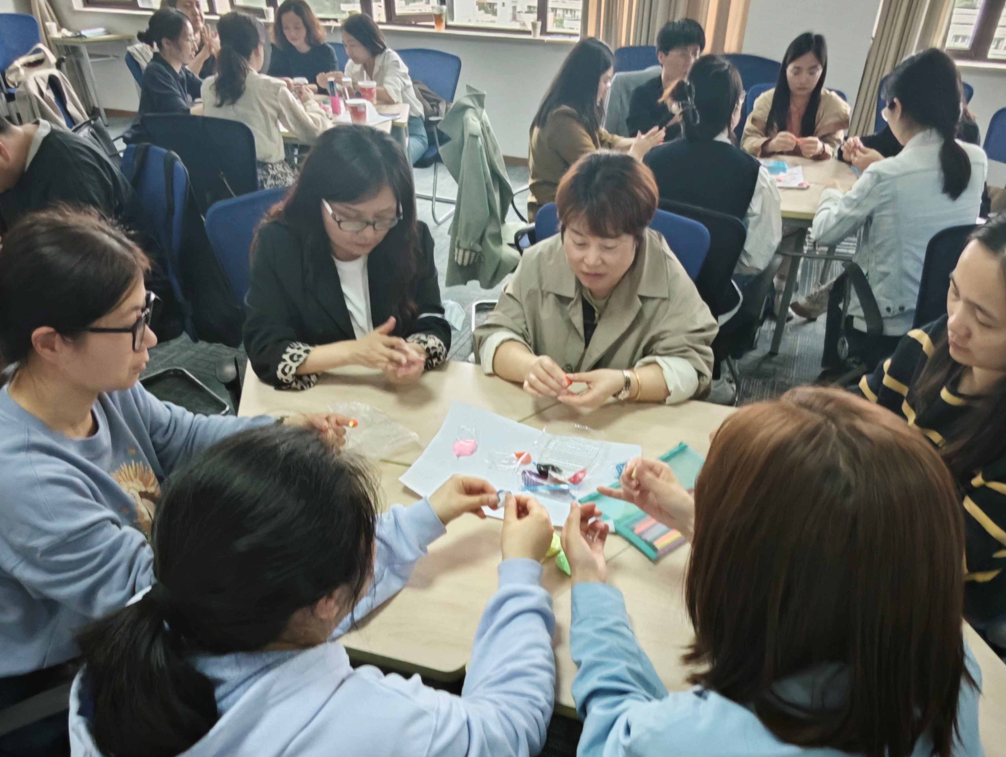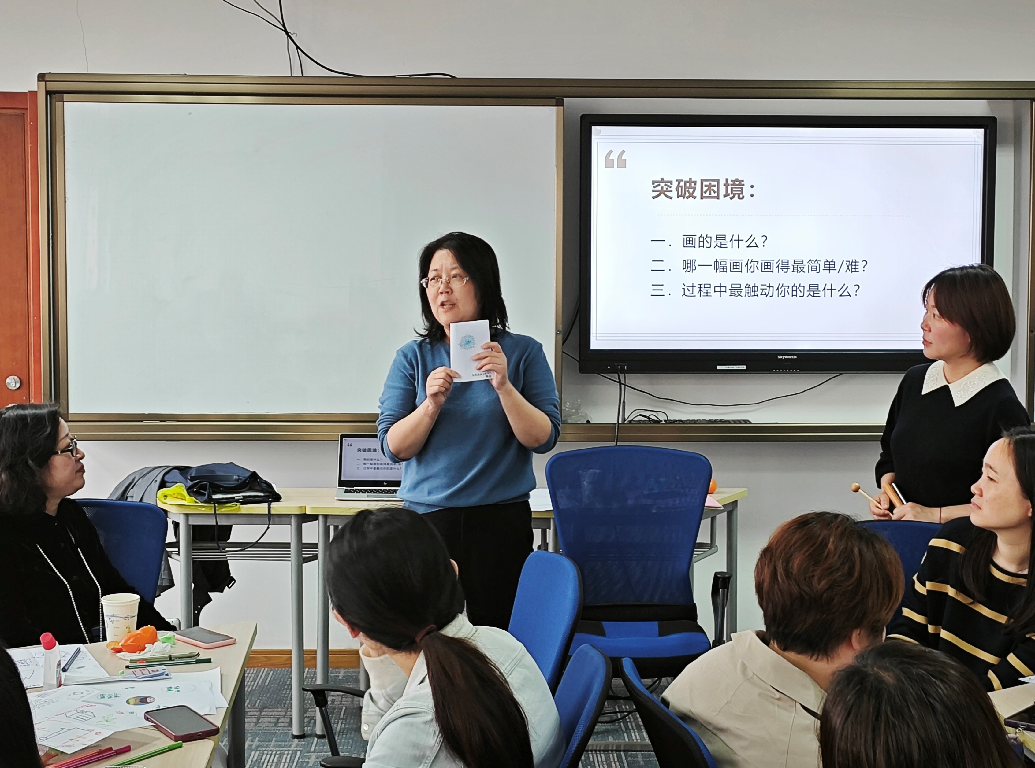 第六场培训主题是《焦虑纾解团体化技术指导》,由上海中医药大学心理咨询与发展中心主任、上海高校心理咨询协会理事林磊副教授主讲。林老师首先带来了中医文化特色的手指操,唤醒了教师们午后疲惫的身心;接着带来了丰富的团体活动体验:通过超轻黏土和光谱图将压力感受可视化;通过压力圈图仔细体会压力的影响;通过绘画探索突破困境的压力应对方法。大家在学习的同时,自己的压力也得到了释放。