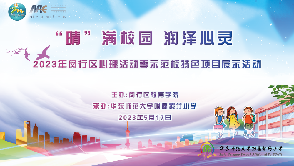 为切实推进学校心理健康教育工作,鼓励并支持区域各校不断探索以学生为主体的心理健康教育方式,加强区域心理示范校的引领辐射作用,2023年5月17日下午,闵行区教育学院特举办主题为“‘晴’满校园 润泽心灵”的区心理活动季示范校特色项目展示活动,活动由华东师范大学附属紫竹小学承办。