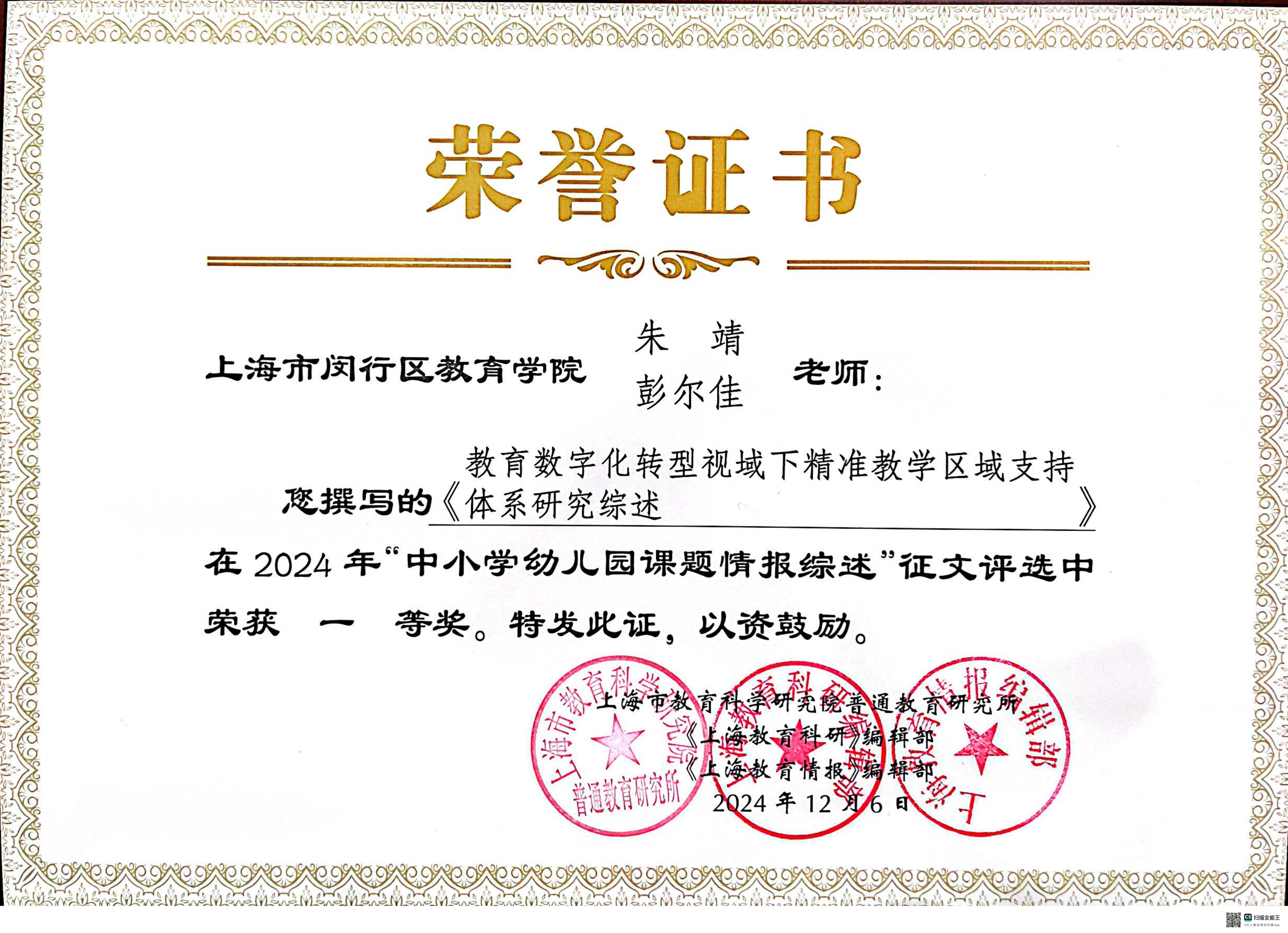 2024年12月,朱靖、彭尔佳二位老师撰写的《教育数字化转型视域下精准教学区域支持体系研究综述》荣获2024年“中小学幼儿园课题情报综述”征文评选一等奖。
