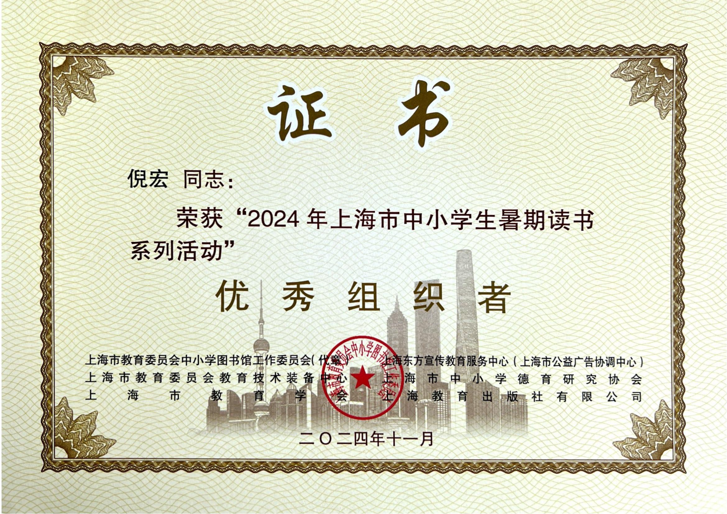 2024年11月,倪宏老师荣获“2024上海市中小学暑期读书系列活动优秀组织者”称号。