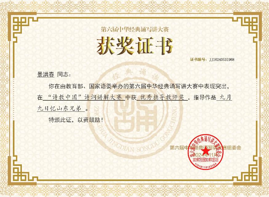 2024年11月,景洪春老师在教育部、国家语委举办的第六届中华经典诵写讲大赛中表现突出,荣获优秀指导教师奖。