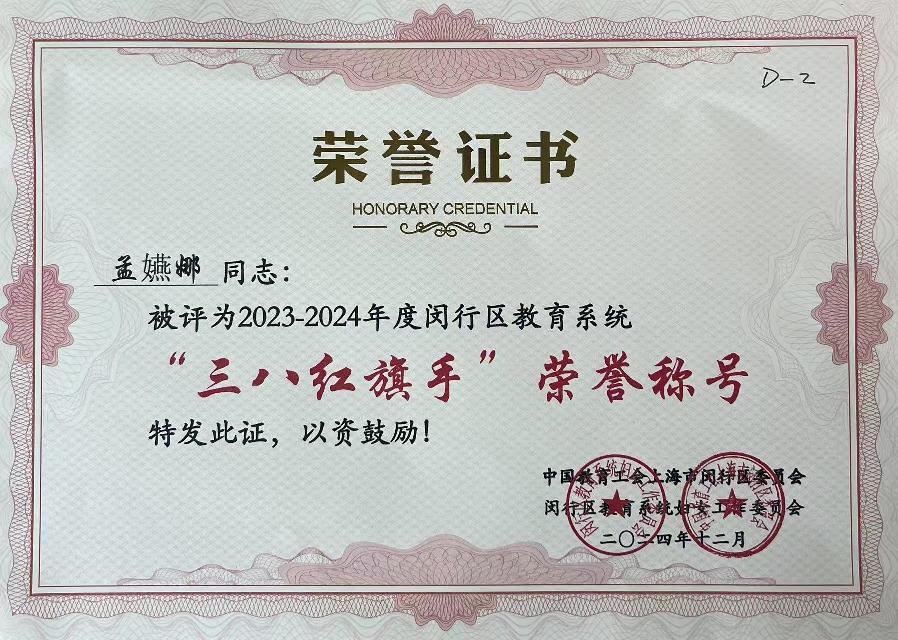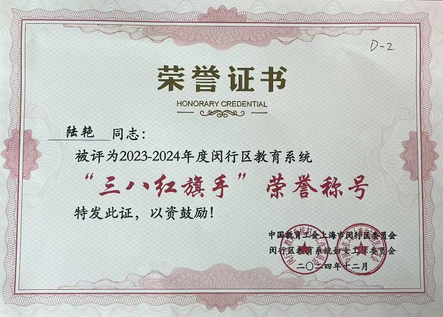 2024年12月,学院陆艳、孟嬿娜二位老师被评为2023-2024年度闵行区教育系统“三八红旗手”荣誉称号。